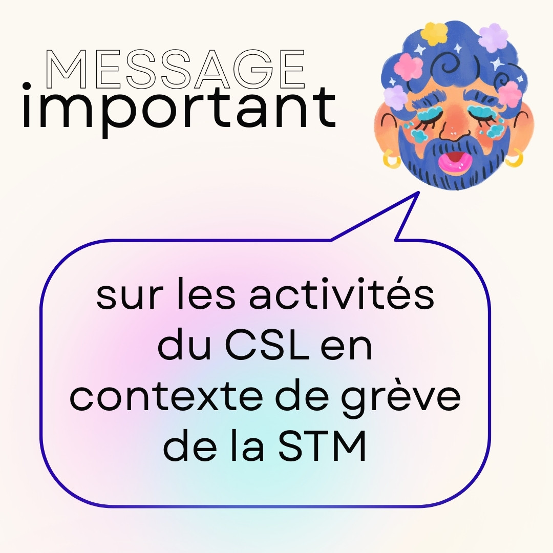 Info-grève du CSL Le Centre restera ouvert pendant la grève de la STM, mais certaines activités seront affectées: – Le Pont Arc-en-Ciel du 22 septembre… Lire la suite »Informations sur les activités du CSL durant la grève de la STM